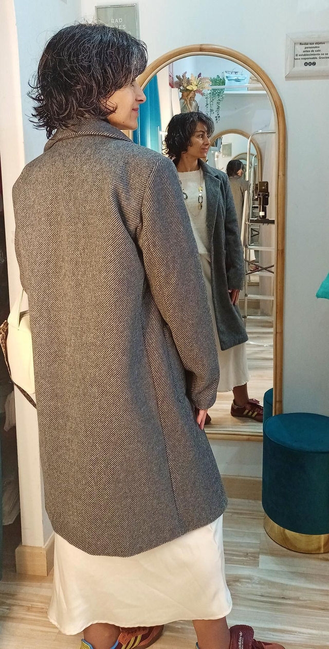 Abrigo paño largo talla única, da hasta una L. Cierre botón único. Forrado. Broche desmontable. 100% poliester.