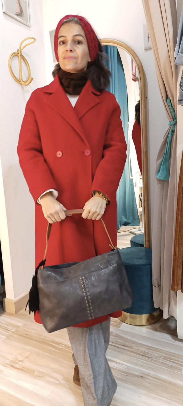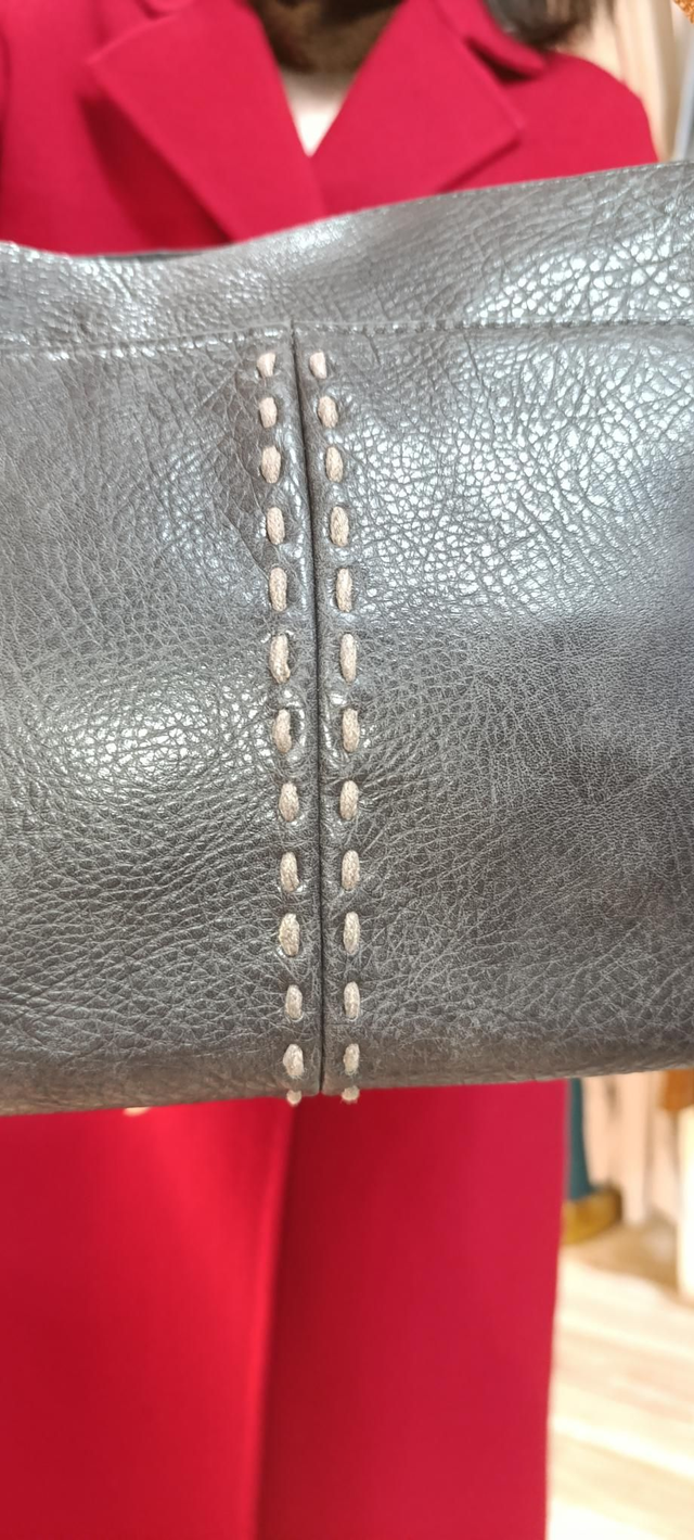 Bolso polipiel, con cierre de cremallera, color gris marengo con pespunte beige y asas color camel. Incluye asa larga