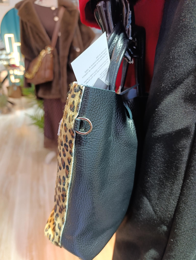 Bolso en piel tipo saquito con asa corta y asa larga, cierre de lazo en tira de cuero