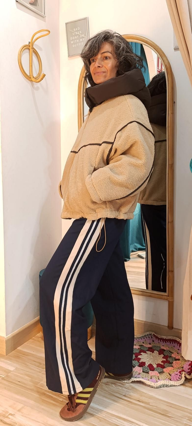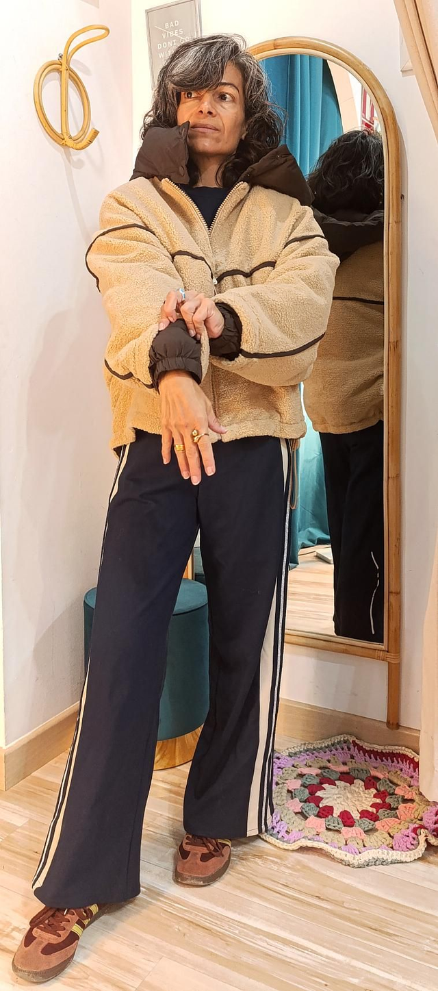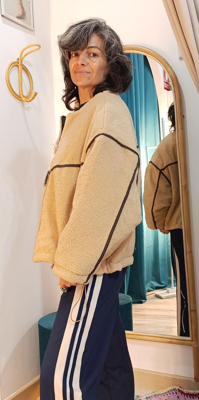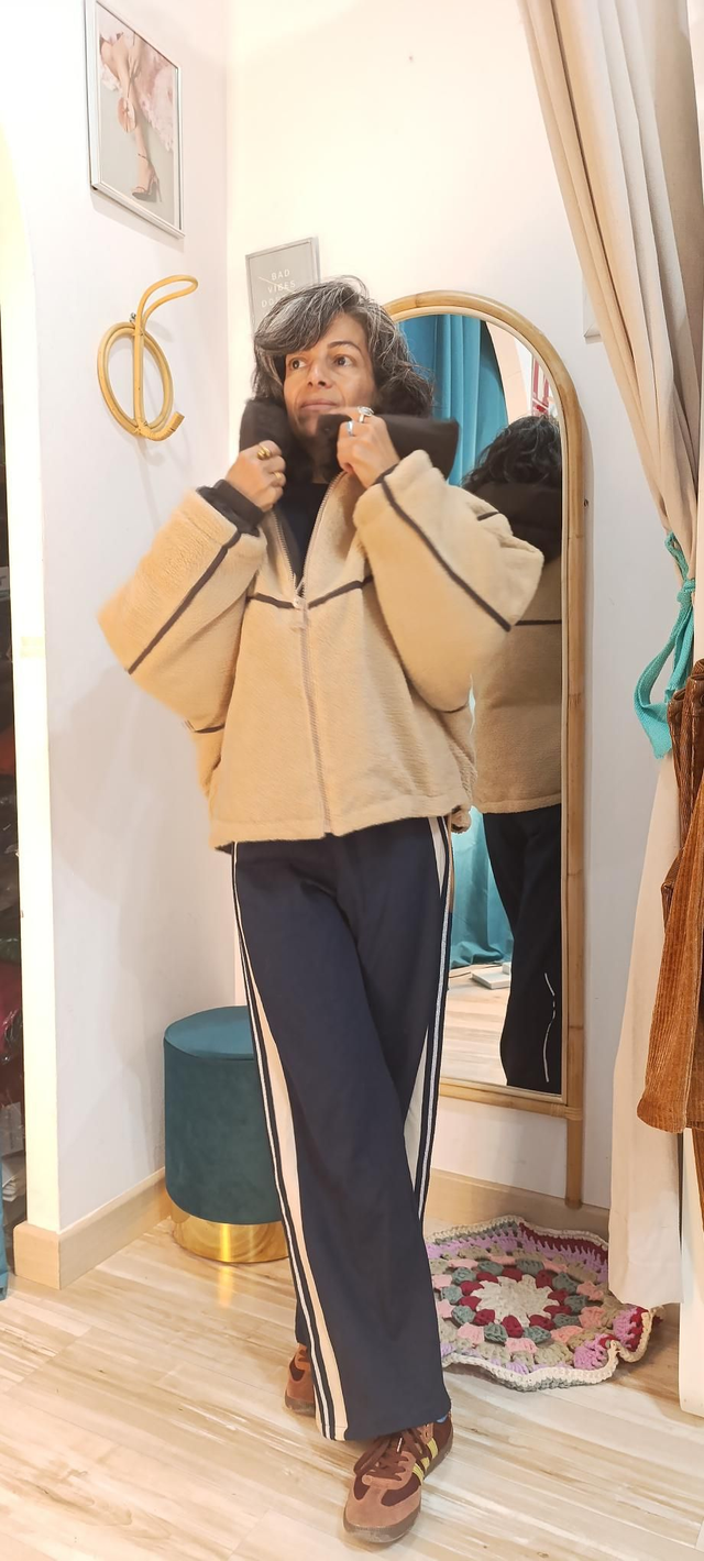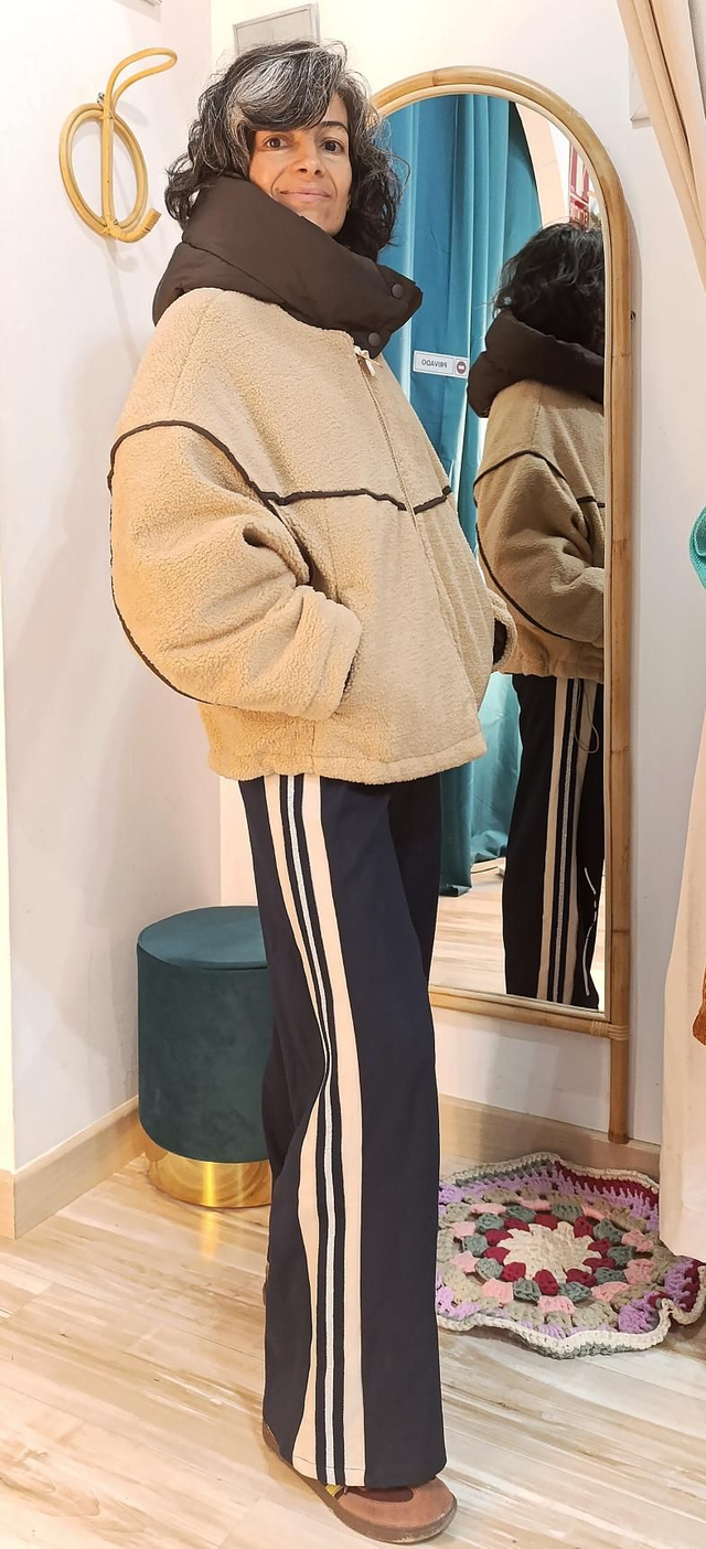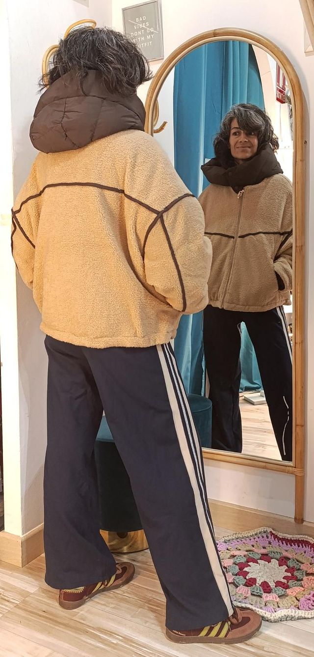 Cazadora corta hasta la cadera, con bajo ajustable, capucha desmontable, exterior borreguito. 100% poliester. Beige y chocolate