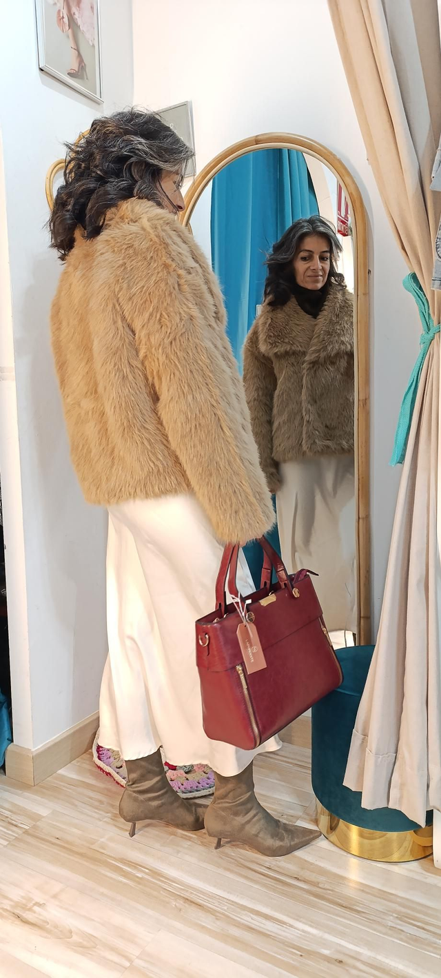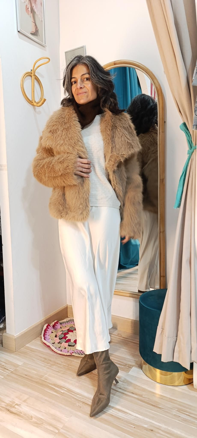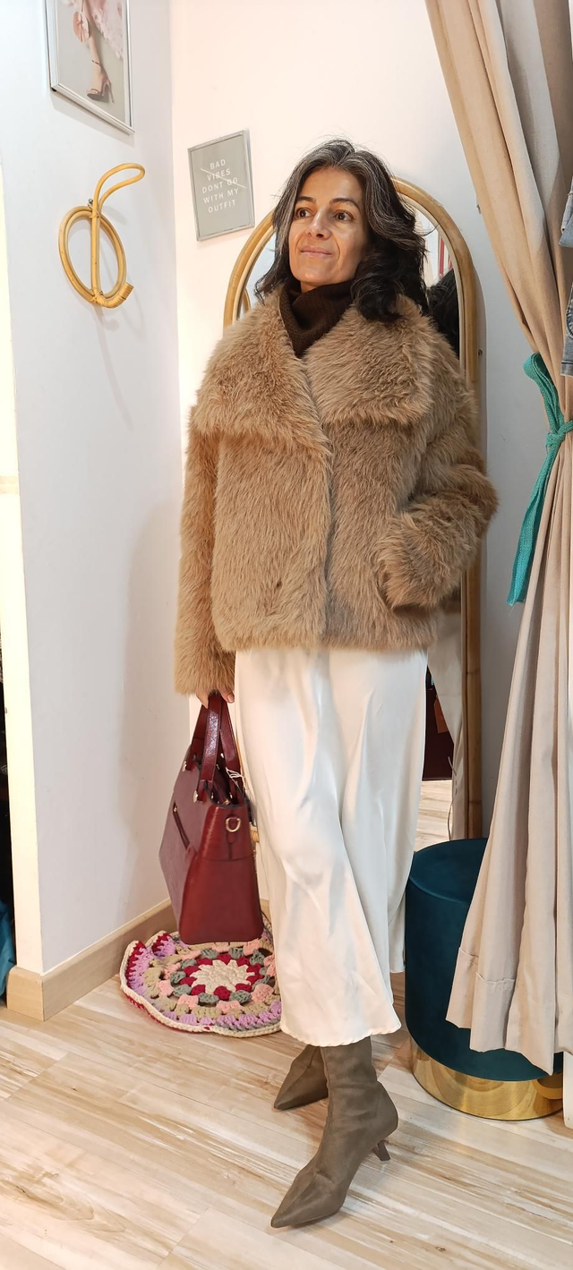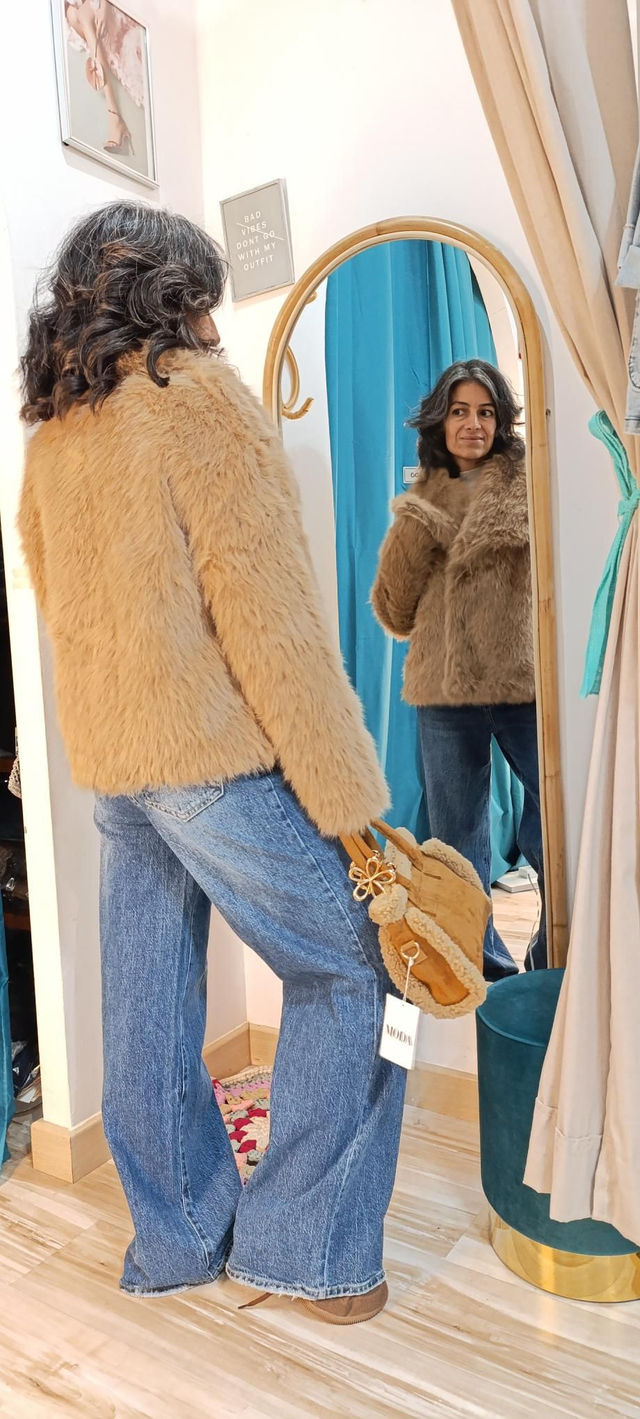 Chaqueta de pelo formato en tendencia, cierre cruzado con clics, grandes solapas y bolsillos laterales
