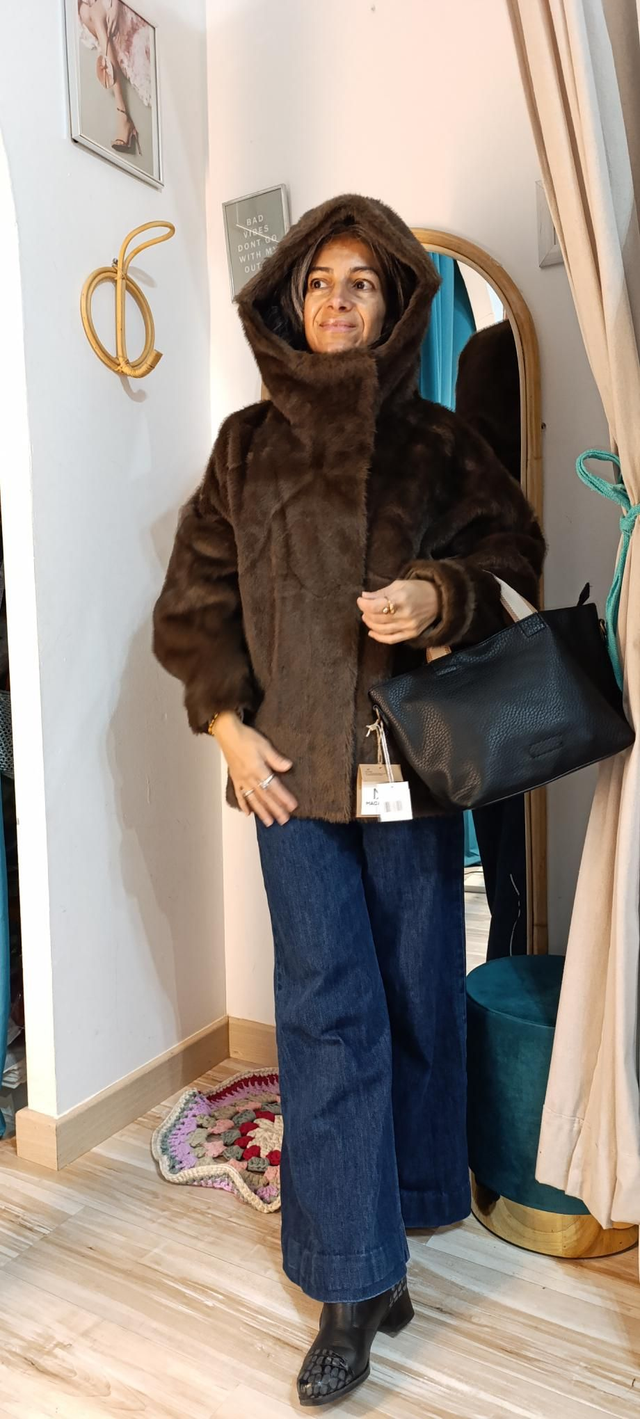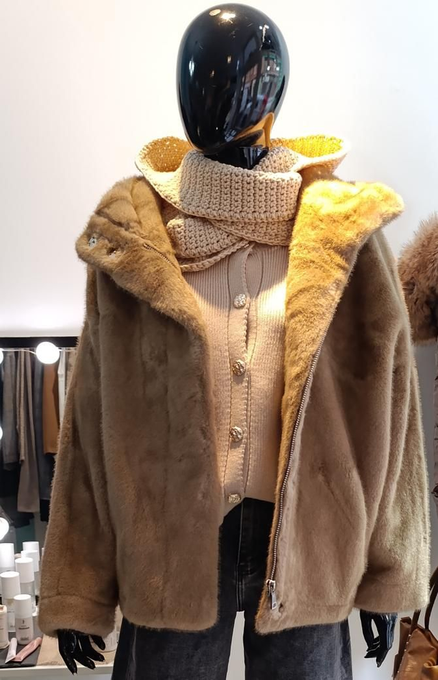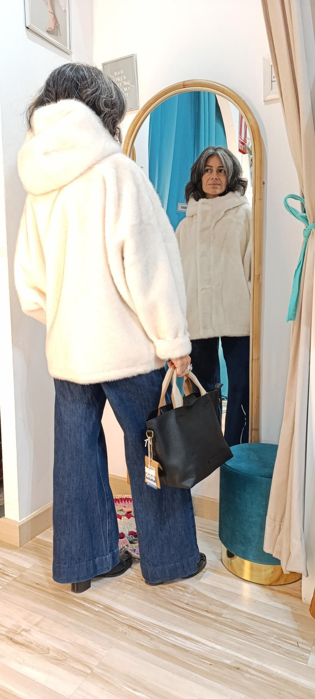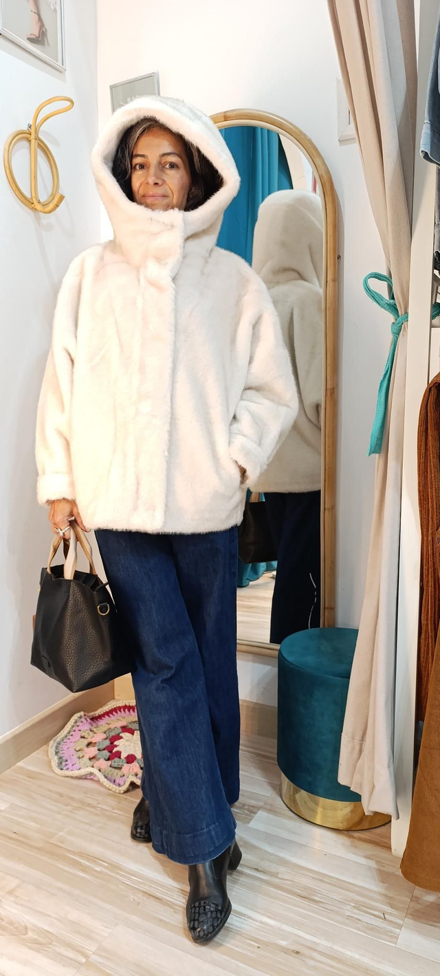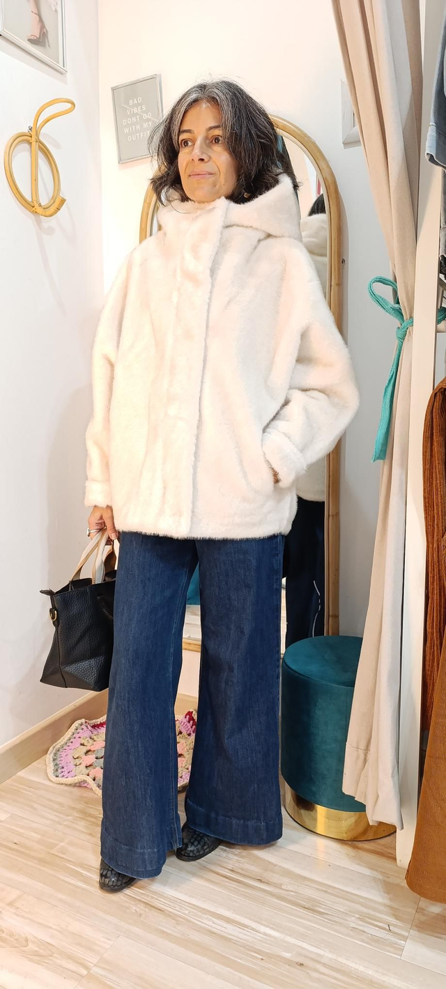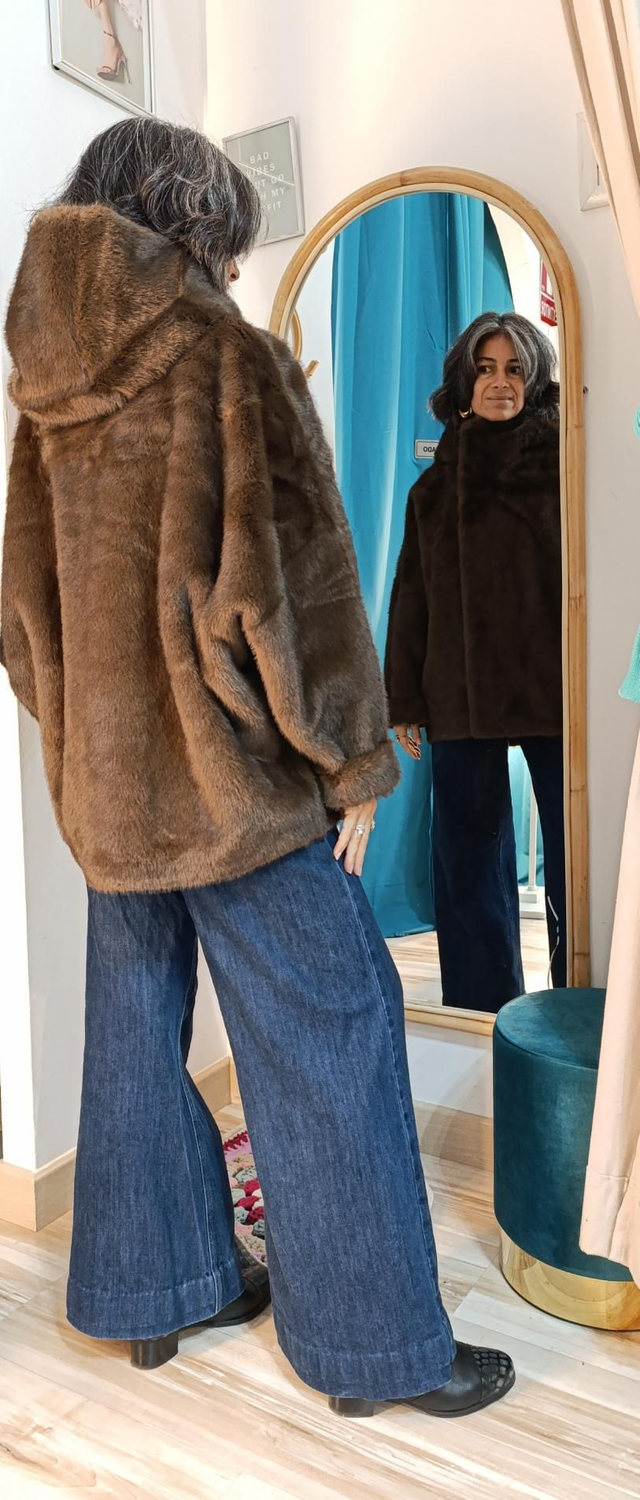 Chaquetón pelito, abriga mucho, con peso superbien acabado por dentro. Cuerre de ceemallera y clics. Capucha y bolsillos imvisibles. Forma ligeramente de globo, super estiloso