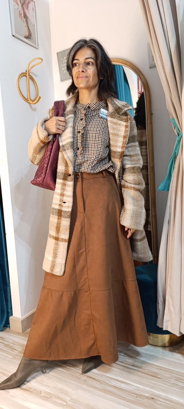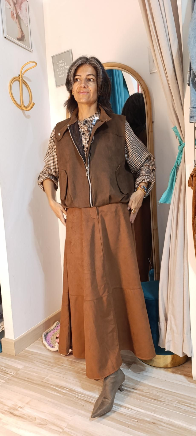Falda en poliester simil ante color camel con cinturilla elástica cuerre de botón y cremallera. Con trabillas. Largura maxi. Talla única da hasta una L