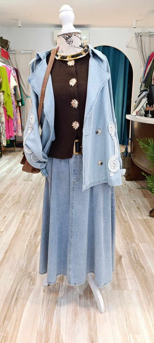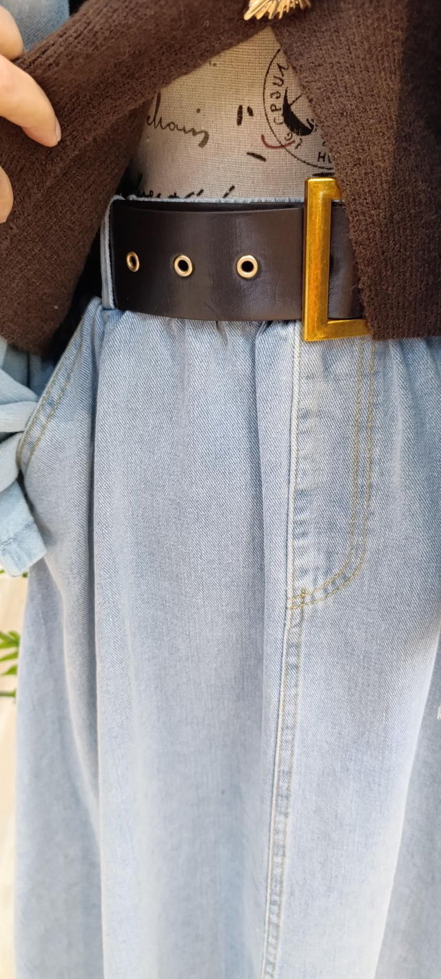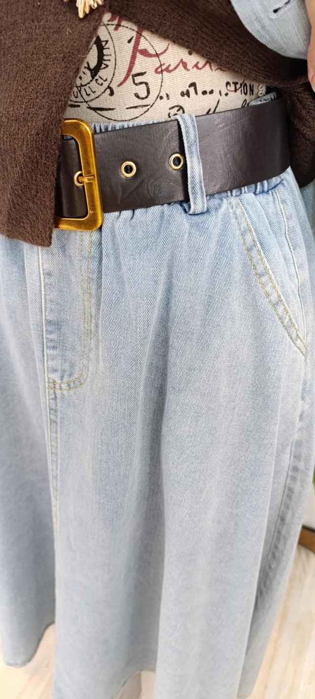 Falda denim en algodón 100% con cinturón polipiel marrón oscuro incluido. Trabillas, bolsillos y cinturilla elástica. Largura midi