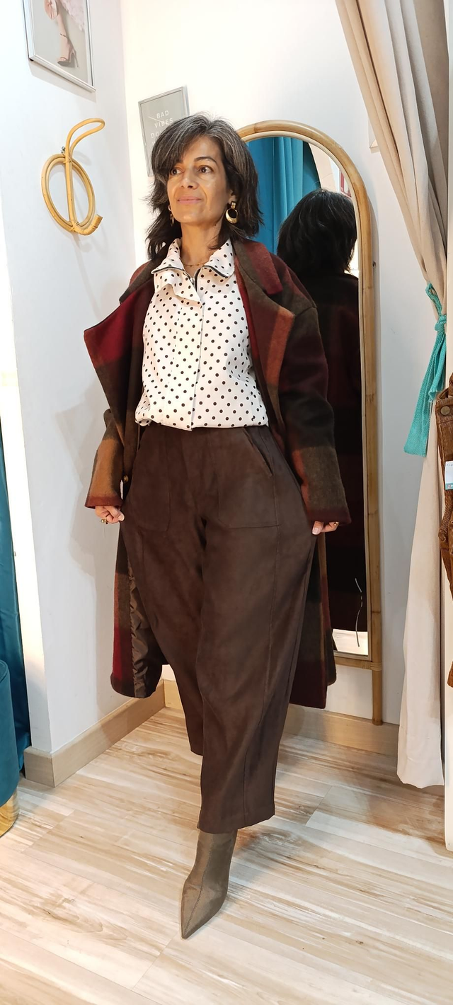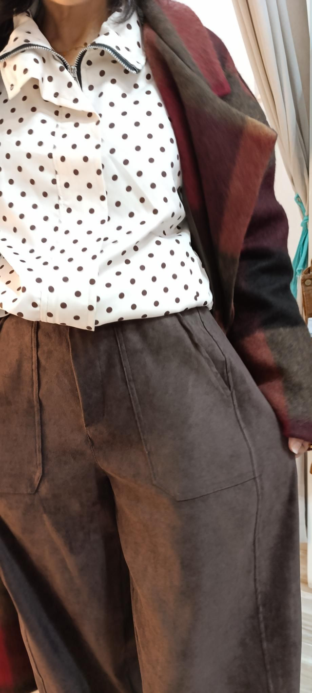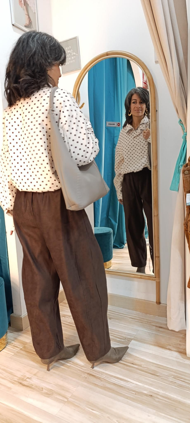 Pantalón corte barrel, con elástico en la cintura, botón y cremallera, cinturón incluido.