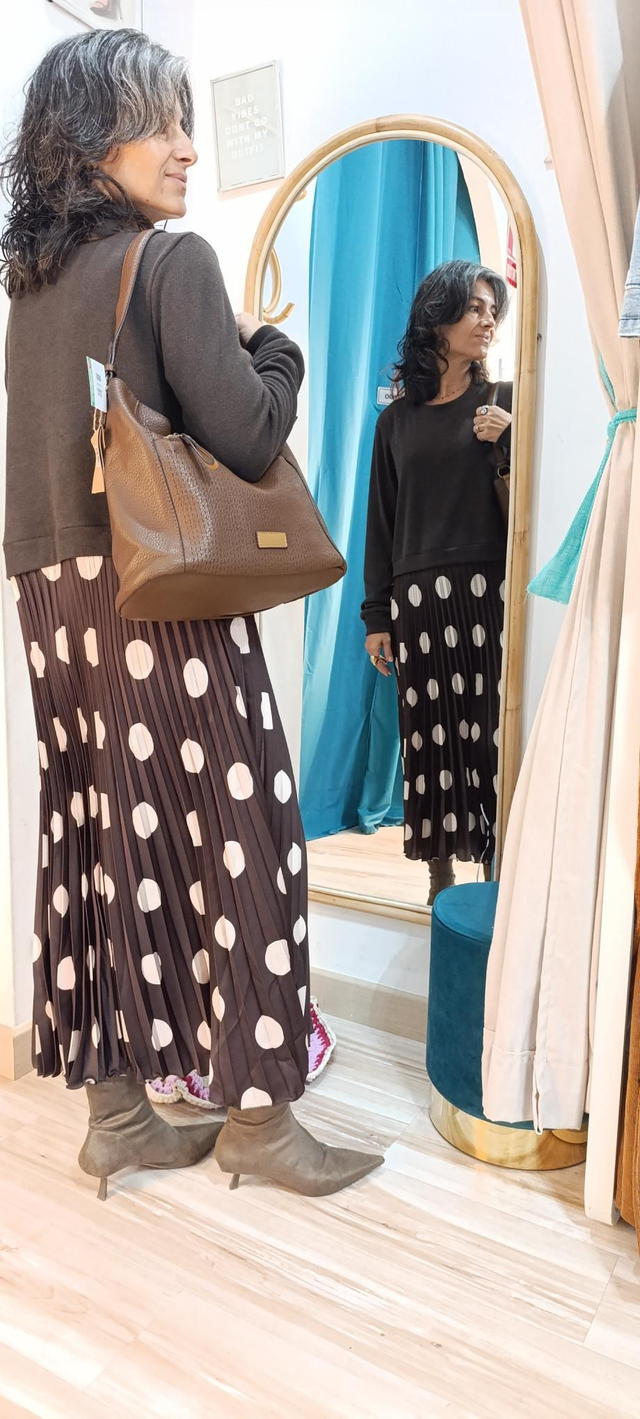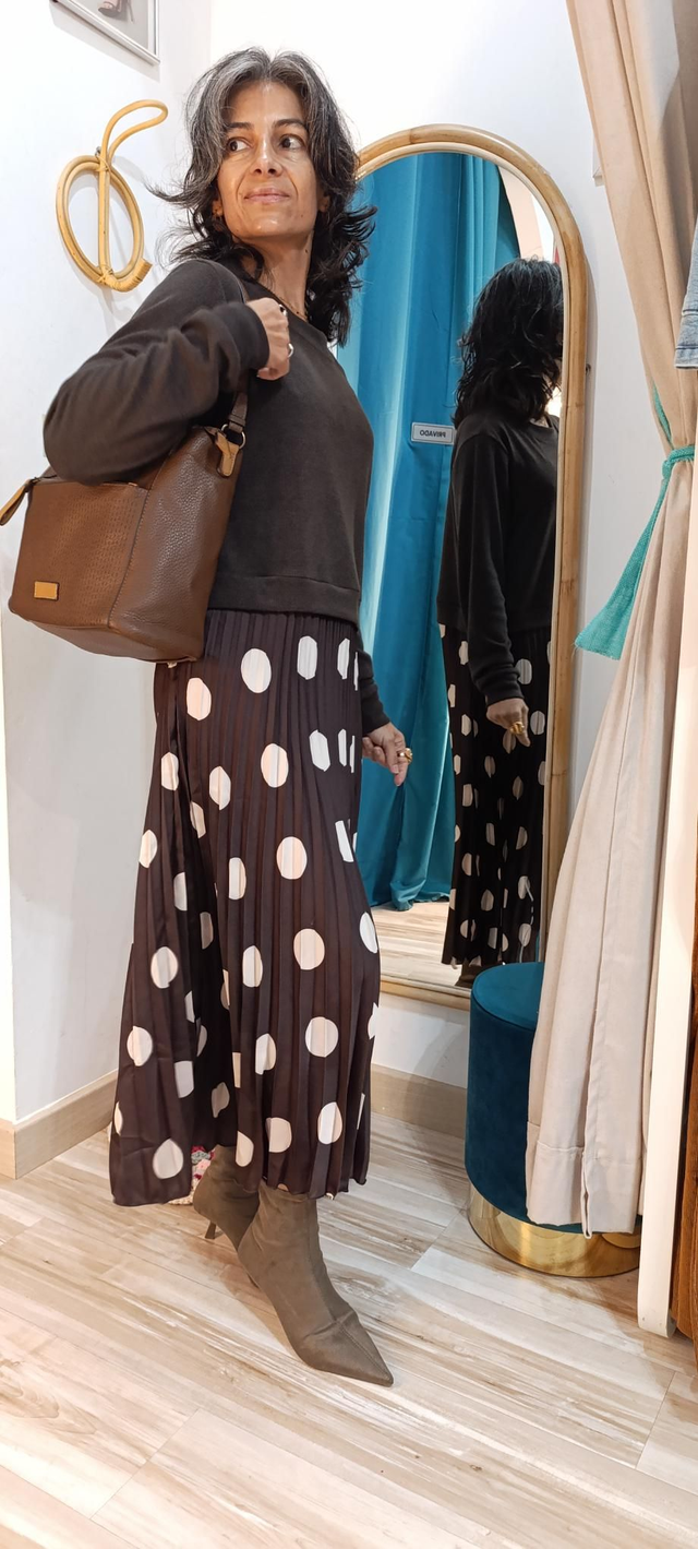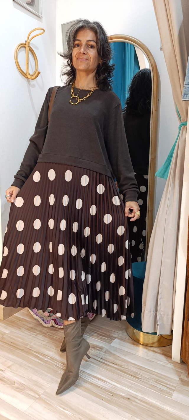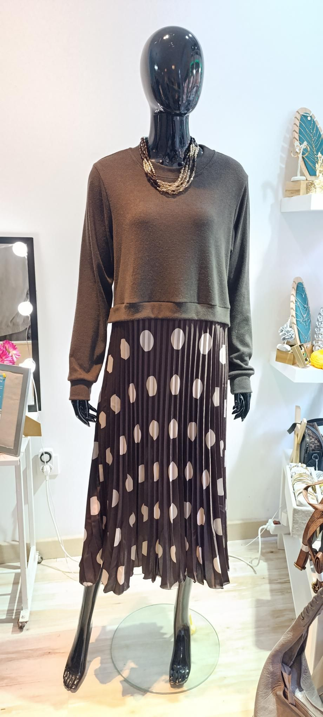 Vestido mixto con cuerpo de punto manga larga y falda plisada en topos chocolate y blanco. Talla única da hasta una L.